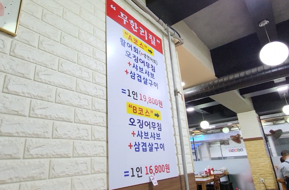 - A 코스 : 19,800원 (활어회, 생연어회, 오징어무침, 샤브샤브, 삼겹살 무한리필)